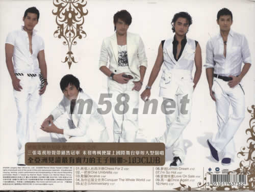 終于等到我的完美情人 183CLUB首張同名專(zhuān)輯10首完美情人真心告白曲 魅力主打:浪漫R&B[一把傘]熾熱舞曲[I'M SO HOT]抒情民謠[再一遍]印度風(fēng)HIP HOP[兩個(gè)人的西洋棋] 締造音樂(lè)新紀(jì)錄魅力征服全亞洲 三張電視原聲帶銷(xiāo)售冠軍 未發(fā)專(zhuān)輯便躍上國(guó)際舞臺(tái)舉辦大型個(gè)唱 全亞洲見(jiàn)證最有實(shí)力的王子團(tuán)體:183CLUB