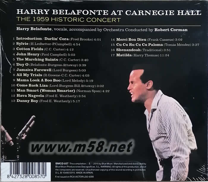 BELAFONTE AT CARNEGIE HALL 貝拉芬堤在卡耐基大廳 立體聲名盤(TAS專業推介發燒名盤)(m58.net) 在上世紀五、六十年代開始,他是美國流行音樂史上與貓王齊名的偉大黑人歌手,是真正的黑人民族音樂發揚者,他以摻雜西印度群島加利帕騷(galypso)風格的演唱特色而傾倒眾生。與貓王的英年早逝相對比,BELAFONTE可說是株長青樹,他德高望重,健康長壽。熱心公益事業,本張專輯的絕靚現場演出,就是為做慈善。技佳,德美,傾倒眾生。幾十年來,一直是美國發燒界的模子。 他的嗓音中氣十足,嘹亮渾厚,肺活量大得驚人,嘖嘖,就憑這樣的底氣,不服不行。他既擅長古典,也擅長爵士,絕對發燒的一把好嗓!值得收藏!