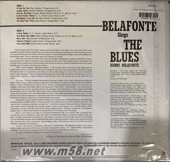 貝拉芬提 藍調SINGS THE BLUES 黑膠(m58.net) Harry Belafonte,人稱“卡利普索歌曲之王”,是最成功的美籍非裔音樂明星之一,其吸收了民謠、爵士和世界打擊節奏音樂的精髓,在主流音樂方面取得了成功,其受到歡迎的程度在黑人民權運動之前絕無僅有,而且他也是民權運動的先鋒,2000年獲得格萊美終身成就獎。 1927年03月01日生于紐約市哈萊姆區。童年時代在牙買加他父親的出生地過著貧困的生活。二戰結束后,他勤工儉學在紐約戲劇進修所學習。1952年開始以唱民歌作為他的職業。1953年第一次上銀幕,演出《光輝的道路》。同年,他還在百老匯演出《約翰.默里.安迪森的年歷》,獲戲劇托尼獎。 他于1987年獲任命為兒童基金會的親善大使。Belafonte先生在一生中一直公開反對不正義。他站在美國境內捍衛人權斗爭的前列,也是“藝術家聯合援助非洲協會”的一位核心人士,并曾參加演唱1986年那首名為“我們是世界”的歌。 Belafonte先生多年來一直支持兒童基金會的各項努力,組織了義演音樂會和籌款活動并參加演出,走訪各國并為兒童大聲疾呼。他向美國國會做了各種工作,力圖說明當局制訂各項惠及兒童的政策,這些努力對于兒童基金會和世界各地兒童的事業來說十分重要。