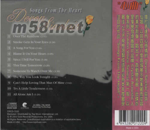 擅于表達(dá)內(nèi)心感情的Devon Sinclair 荻芬·仙姬,以其四個(gè)八度音域展示她美麗而從容的美妙歌聲,唱出十一首動聽名曲。此碟亦是享譽(yù)發(fā)燒圈唱片品牌Crystal Acoustic人聲系列(Golden Voice Series)第一炮,以最佳24/96規(guī)格泡制成這張必為本年度最愛注目的作品“Songs From The Heart"