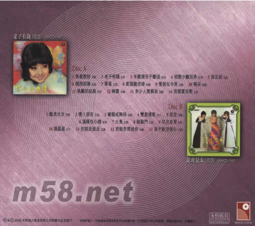 Disc A 01. 恭喜發財 02. 老子有錢 03. 辛酸淚兒不斷流 04. 相聚少離別多 05. 毋忘我 06. 煙雨斜陽 07. 寒星 08. 柔道龍虎榜 09. 愛我在今宵 10. 喝采 11. 美麗的姑娘 12. 晚霞 13. 多少人羨慕我 14. 我需要安慰 Disc B 01. 龍虎兒女 02. 嘿!朋友 03. 葡萄成熟時 04. 雙星情歌 05. 夜空 06. 溫暖在心里 07. 火鳥 08. 敲敲門 09. 花月良宵 10. 淚盈盈 11. 你說走就走 12. 把相思帶給你 13. 我不能沒信心