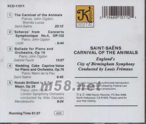 1.THE CARNIVAL OF THE ANIMALS PIANOS:JOHN OGDON,BRENDA LUCAS SAINT -SAENS 2."SCHERZO"FROM CONCERTO SYMPHONIQUE NO.4 OP.102 PIANO:JOHN OGDON LITOLTT 3.BALLADE FOR PIANO AND ORCHESTRA,OP 19 PIANO: JOHN OGDON GABRIEL FAURE 4.WEDDING CAKE CAPRICE-VAISSE FOR PIANO AND ORCHESTRA,OP.76 PIANO:MARIS DE LA PAU SAINT-SAENS 5.RONDO BRILLIANT IN E FLAT MAJOR,OP.29 PIANO:JOHN OGDON LONDON SYMPHONY ORCHESTRA CONDUCTED BY ALDO CECCATO MENDELSSOHN
