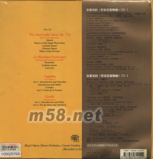 CD1 安塞美的《皇家芭蕾舞曲》 胡桃夾子組曲,作品第71號 彼得·伊裹奇·柴科夫斯基 01 進行曲 02 糖果仙子舞曲 03 阿拉伯舞曲 04 中國舞曲 05 蘆笛舞曲 06 花之圓舞曲 古怪的玩具店 喬阿基諾·羅西尼,奧托裹諾·雷斯庇基 07 塔蘭泰拉舞曲 08 稍快的行板 09 康康舞 葛蓓莉亞 雷奧·德利勃 10 序曲和瑪祖卡(第一幕) 11 序曲和圓舞曲 12 查爾達什 13 木偶圓舞曲 吉賽爾 阿道夫·亞當 14 序曲和圓舞曲(第一幕) 15 雙人舞及變奏(第二幕) CD2 安塞美的《皇家芭蕾舞曲》 天鵝湖 彼得·伊裹奇·柴科夫斯基 01 場景;小天鵝舞曲;場景;雙人舞,華爾茲(第二幕) 1.場景 2.小天鵝舞曲 3.雙人舞 4.華爾茲 狂歡節(jié),作品第9號 羅伯特·舒曼 02 彼埃羅,晚餐,科倫拜恩的長褲 睡美人,作品66號 彼得·伊裹奇·柴科夫斯基 03 序曲,開場 04 玫瑰花的慢板舞曲,大圓舞曲(第一幕) 05 圓舞曲 仙女 弗雷德裹克·肖邦 06 序曲:A大調前奏曲,作品28號第7首 07 C大調馬祖卡,作品67號第3首 08 降E大調第一號圓舞曲(華麗大圓舞曲)作品18號 指揮:恩斯特·安塞美 演奏:皇家歌劇院管弦樂團