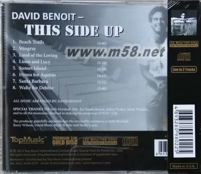 爵士鋼琴大師 This Side Up 24K金碟(m58.net) 三十年來,格萊美提名鋼琴家、作曲家、編曲家David Benoit無疑是當(dāng)代爵士樂的創(chuàng)始人之一。 Benoit獲得了三次格萊美獎最佳當(dāng)代爵士演出的提名,分別是《Every Step of the Way》 (1989), 《Best Large Ensemble Performance for GRP All-Star Big Band》(1996), 和《Best Instrumental Composition for "Dad's Room"》,后者是來自專輯《Professional Dreamer》 (2000)。2010年,Benoit獲得了美國Lifetime Achievement Award 的Smooth Jazz 獎項(xiàng),他還與包括Rippingtons, Emily Remler, Alphonse Mouzon, Dave Koz, Faith Hill, David Sanborn, CeCe Winans和Brian McKnight在內(nèi)的眾多音樂人合作。 這個fusion錄音效果靚到驚人,相信原因有兩個:一,灌錄時直接錄入兩軌母帶,不作任何混音處理,務(wù)求原汁原味;二,監(jiān)制者系Jeff Weber,此公本身系Hi-Fi友,每逢錄音必用Threshold 加 Martin-Logan監(jiān)聽,由Jeff監(jiān)制的錄音幾乎全屬精品(他替Denon監(jiān)制的jazz及fusion錄音系好例子),此碟太出色,Dave Wilson都用它來示范Watt + Puppy(他用track 1,《Beavh Trails》)
