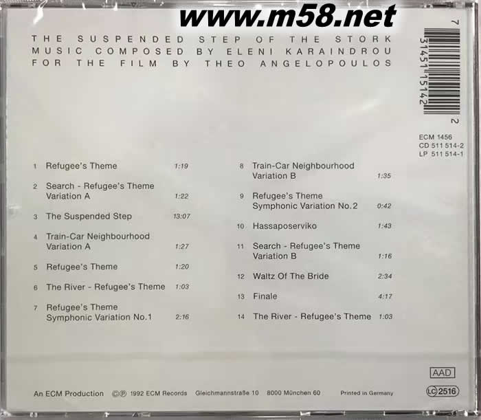 鸛鳥踟躇 THE SUSPENDED STEP OF THE STORK(m58.net) 如低泣哀鳴的低音提琴,以及法國號為樂曲增添沉穩厚實的背景底襯,藉由弦樂聲部帶出的希臘民俗樂調性,再使用雙簧管帶出孤獨的幽微氣氛,著實巧妙地牽動人心?!尔X鳥躑躅》細膩哀愁的弦外之音,與其極為優美的旋律聲線,揉合美麗的雙簧管音色渲染出無比的無奈,徹底道出那可歌可泣的民族受難歷史。 Eleni Karaindou的音樂就像血液,樂音無處不在,暗示著一些隱藏在抒情旋律下的深沉精神性。她所創作的音樂不但是一種刺痛和解放,甚至創造了新的視野和觀念。即使單獨聆聽本作,仍能感受到它依舊堅持著樂章的獨立性。 希臘作曲兼鋼琴家的伊蓮妮.卡蘭卓(Eleni Karaindou)所做的電影配樂后,那景象彷彿就浮現在眼前。Karaindou本人曾說過:「我感覺自己像個畫家,從千千萬萬種色彩中選擇,輕涂慢抹出一些作品。」從此可以了解她的音樂創作靈感的來源,其實就是日常生活的經歷體驗。只是Karaindou能夠很自然不矯飾地將其譜出每個音符都充滿意義的深沉樂章。 出生於希臘,在雅典學習鋼琴和音樂理論,長期致力於復興及發揚傳統樂器及音樂的Karaindou,后來將此創作能量與電影及戲劇配樂結合,在1982年,與希臘大導安哲羅普羅斯(Theo Angelopoulos)合作多部經典電影的配樂后,達到她創作生涯的最頂峰。Angelopoulos那客觀論述人生百態的觀點,以及擅用長鏡頭拍出寂靜孤傲的運鏡手法,與Karaindou所譜的孤寂樂章可以說是如魚得水。本張專輯即是替電影《鸛鳥躑躅》(The Suspended StepOf The Stork)所精心打造的篇章。