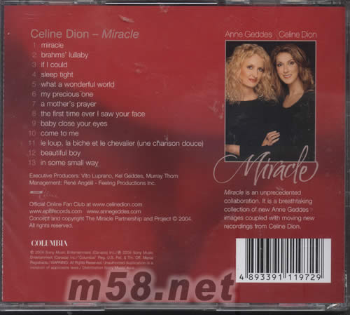 2004年10月國際流行樂壇天后席琳迪翁(CELINE DION)將要推出她的又一張最新專輯《愛的奇跡(MIRACLE)》。這張專輯不同于以往任何一張專輯,將是CELINE DION和國際著名的嬰兒攝影家ANNE GEDDES共同合作的產物,用溫暖的音樂和深情的攝影共同來表現母愛的偉大和嬰兒的可愛。CELINE DION目前已經成為了孩子的母親,并非常愛自己的孩子,對于這張專輯她融入了許多生活當中與孩子之間的真情實感,并用自己的歌聲聲情并茂地表達了這份情感。CELINE DION和ANNE GEDDES都認為每一個來到這個世界上的新生命都是一個奇跡,而這個奇跡的根源來自于我們內心的真情。