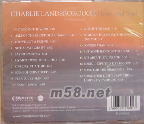 民歌情懷HEART AND SOUL(m58.net) Songs of love and songs of inspiration; some old standards, some of Charlie's own songs. A deeply religious man, Heart And Soul is Charlie Landsborough's first ever album to consist entirely of inspirational and religious tracks, and with his penchant for a thoughtful melody and highly meaningful lyrics the results are truly memorable. Nine of the these tracks are original compositions written by Charlie, whilst the album also features classic tracks such as Bob Dylan's Blowing In The Wind, You've Got A Friend by Carole King and One Day At A Time, a UK No 1 for Lena Martell. A gentle country style backing band, and the Reuben String Ensemble highlight Charlie's vocals and comforting guitar
