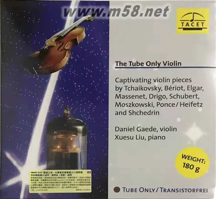 丹尼爾·蓋德 & 劉學述 - 真空管麥克風之小提琴篇 180g 33RPM LP 黑膠(m58.net) Tacet為拉丁文“沉默的”,也就是不與別人做同樣的事,亦即Tacet是杰出且與眾不同的。Tacet的創建者是德國有名的錄音專業教授,他創立這一家公司就是想表現最高技藝的音響效果,全部專輯都是選用最專業的器材、聘請最專業的工程人員及最優秀的音樂家完成的,所以Tacet所出產的音樂產品是發燒友測試音響及聆賞音樂非常好的選擇。 Tacet這家公司在業界以真空管麥克風錄音著名,很多樂友在買了Tacet的音樂專輯之后,均訝異Tacet竟能以很多比我們年紀還大的古董級的真空管麥克風,錄下這么富有甜美光澤的古典及爵士音樂,以至于在1994-1996年的時候,港臺地區均刮起一陣Tacet發燒旋風,眾發燒友的發燒收藏榜單之中如果沒有一張Tacet的專輯,那么很有可能會被認為發燒友的資歷及對唱片市場生態的熟悉度有限。 本張《真空管麥克風之小提琴篇》限量版LP黑膠碟的聲音醇美厚實,是用名聲響亮的Neumann M49、U47真空管麥克風來錄音,再由真空管來放大訊號,最后呈現出自然真實、靚絕通透的細致音色。丹尼爾?蓋德(Daniel Gaede)憑借他高超的技藝和體善人心的風范,獻上了一張獨一無二的傳奇巨作! 丹尼爾?蓋德和鋼琴家劉學述(Liu Xuesu) 以及波蘭國家交響樂團天衣無縫的默契配合,再加上拉伊斯基 (Wojciech Rajski)的指揮,和空氣感十足的錄音效果,將真空管的優點顯露無遺。里面的小提琴的錄音真是靚到無法形容,弦樂像涂了一層蜜糖似的,甜美甘醇,優雅華貴還不足以形容它們的特色,看它們的空氣感多好,余韻裊裊,喜歡小提琴音樂的朋友千萬不要錯過。