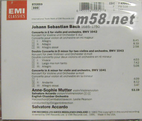 1 Concerto for violin, strings & continuo No. 2 in E major, BWV 1042 - (1. Allegro) - 8:47 Performers: Anne-Sophie Mutter (Violin), Leslie Pearson (Harpsichord) Orchestra/Ensemble: English Chamber Orchestra Conductor: Salvatore Accardo 2 Concerto for violin, strings & continuo No. 2 in E major, BWV 1042 - (2. Adagio) - 8:19 Performers: Anne-Sophie Mutter (Violin), Leslie Pearson (Harpsichord) Orchestra/Ensemble: English Chamber Orchestra Conductor: Salvatore Accardo 3 Concerto for violin, strings & continuo No. 2 in E major, BWV 1042 - (3. Allegro assai) - 3:02 Performers: Anne-Sophie Mutter (Violin), Leslie Pearson (Harpsichord) Orchestra/Ensemble: English Chamber Orchestra Conductor: Salvatore Accardo 4 Concerto for 2 violins, strings & continuo in D minor ("Double"), BWV 1043 - (1. Vivace) - 4:04 Performers: Salvatore Accardo (Violin), Anne-Sophie Mutter (Violin), Leslie Pearson (Harpsichord) Orchestra/Ensemble: English Chamber Orchestra Conductor: Salvatore Accardo 5 Concerto for 2 violins, strings & continuo in D minor ("Double"), BWV 1043 - (2. Largo ma non tanto) - 7:42 Performers: Salvatore Accardo (Violin), Anne-Sophie Mutter (Violin), Leslie Pearson (Harpsichord) Orchestra/Ensemble: English Chamber Orchestra Conductor: Salvatore Accardo 6 Concerto for 2 violins, strings & continuo in D minor ("Double"), BWV 1043 - (3. Allegro) - 5:13 Performers: Salvatore Accardo (Violin), Anne-Sophie Mutter (Violin), Leslie Pearson (Harpsichord) Orchestra/Ensemble: English Chamber Orchestra Conductor: Salvatore Accardo 7 Concerto for violin, strings & continuo No. 1 in A minor, BWV 1041 - (1.) - 4:10 Performers: Anne-Sophie Mutter (Violin), Leslie Pearson (Harpsichord) Orchestra/Ensemble: English Chamber Orchestra Conductor: Salvatore Accardo 8 Concerto for violin, strings & continuo No. 1 in A minor, BWV 1041 - (2. Andante) - 8:12 Performers: Anne-Sophie Mutter (Violin), Leslie Pearson (Harpsichord) Orchestra/Ensemble: English Chamber Orchestra Conductor: Salvatore Accardo 9 Concerto for violin, strings & continuo No. 1 in A minor, BWV 1041 - (3. Allegro assai) - 3:49 Performers: Anne-Sophie Mutter (Violin), Leslie Pearson (Harpsichord) Orchestra/Ensemble: English Chamber Orchestra Conductor: Salvatore Accardo