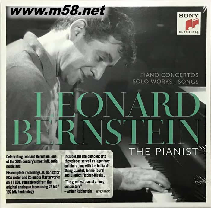 The Pianist Leonard Bernstein 11CD套裝(m58.net) 伯恩斯坦 Leonard Bernstein 伯恩斯坦百歲冥誕紀(jì)念專(zhuān)輯之一。 伯恩斯坦是指揮家中最偉大的鋼琴家,更是鋼琴家中最偉大的作曲家。 經(jīng)常演出協(xié)奏曲時(shí)一邊指揮樂(lè)團(tuán)一邊演奏鋼琴,或是為聲樂(lè)家以鋼琴伴奏。 在多重盛名影響下,往往掩蓋了他作為鋼琴演奏家的實(shí)際能力。 音樂(lè)大師伯恩斯坦(Leonard Bernstein)誕生于1918年,2018年為其100歲冥誕。為此,SONY唱片公司特別將旗下所擁有的伯恩斯坦鋼琴演奏之錄音,集合成這一套11CD的紀(jì)念專(zhuān)輯。 伯恩斯坦是集指揮家、作曲家、演奏家、教育家、理論家于一身的藝術(shù)大師,其藝術(shù)造詣舉世推崇,并堪稱(chēng)是本世紀(jì)最偉大的指揮家、作曲家及鋼琴家。1918年8月25日出生于麻薩諸塞州的勞倫斯,而于1990年10月14日去世。其主要音樂(lè)教育完成于哈佛大學(xué),1939年畢業(yè)后,又在寇蒂斯音樂(lè)院隨萊納學(xué)習(xí)作曲,1940年在壇格塢伯克夏音樂(lè)中心向庫(kù)塞維茨基(Sergey Koussevitzky)學(xué)習(xí)指揮。 自小接觸學(xué)琴,曾追隨多位老師學(xué)習(xí)。其中包含后來(lái)成為他秘書(shū)的Helen Coates。伯恩斯坦的鋼琴演奏才華在寇蒂斯音樂(lè)院發(fā)展成熟,指導(dǎo)老師便是知名的Isabelle Vengerova。 伯恩斯坦一直認(rèn)為鋼琴是他的初戀,也經(jīng)常演出協(xié)奏曲時(shí)一邊指揮樂(lè)團(tuán)一邊演奏鋼琴,或是為聲樂(lè)家以鋼琴伴奏。早年伯恩斯坦在RCA Victor唱片公司錄制過(guò)拉威爾的《G大調(diào)鋼琴協(xié)奏曲》、亦師亦友的柯普蘭之《鋼琴奏鳴曲》,以及他為自己的連篇聲樂(lè)作品《我討厭音樂(lè)》(I Hate Music)擔(dān)任鋼琴伴奏,并又為次女高音Blanche Thebom演唱的錄音伴奏。他在Columbia唱片公司錄制的鋼琴協(xié)奏曲大多同時(shí)身兼演奏與指揮,錄音包括:拉威爾、莫扎特(K450、K453、K503)、貝多芬第一號(hào)、蕭士塔高維契第二號(hào),以及蓋希文《藍(lán)色狂想曲》。 伯恩斯坦對(duì)于與茱莉亞弦樂(lè)四重奏一同演奏之莫扎特及舒曼室內(nèi)樂(lè)作品錄音感到自豪。而對(duì)于他與次女高音Jennie Tourel多年友誼所合作的穆索斯基《死之歌與舞》、1969年3月2日卡內(nèi)基音樂(lè)會(huì),以及自己的作品之錄音,也相當(dāng)滿意。 除了上述錄音,這套專(zhuān)輯也收錄了絕版許久,鋼琴伴奏版的馬勒《少年魔法號(hào)角》之錄音,由次女高音露德薇希(Christa Ludwig)與低男中音華特‧貝里(Walter Berry)聯(lián)袂獻(xiàn)唱。另外也收錄露德薇希演唱的布拉姆斯藝術(shù)歌曲,以及男中音費(fèi)雪狄斯考所唱的馬勒作品。以上均由伯恩斯坦擔(dān)任鋼琴伴奏。 曾有人稱(chēng)伯恩斯坦是「指揮家中最偉大的鋼琴家、作曲家中最偉大的指揮家,以及鋼琴家中最偉大的作曲家」。三句話便簡(jiǎn)明扼要的將其一生成就定位。作為在音樂(lè)界舉足輕重的指揮家、作曲家、教育家,以及啟發(fā)無(wú)數(shù)人靈感的音樂(lè)導(dǎo)師,在這些盛名影響下,往往掩蓋了他作為鋼琴演奏家的實(shí)際能力。