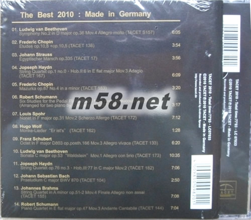 01. Ludwig van Beethoven Symphony No.2 in D major op.36 Mov.4 Allegro molto (TACET S157) 02. Frederic Chopin Etudes op.10,8 +op.10,5 (TACET 138) 03. Johann Strauss Egyptischer Marsch op.335 (TACET 17) 04. Jopseph Haydn String Quartet op.1 no.0,Hob.II:6 in E flat major Mov.3 Adagio (TACET 167) 05. Frederic Chopin Mazurka op.67 No.4 in a minor (TACET 183) 06. Robert Schumann Six Studies for the Pedal Piano op.56 No.2 Avec beaucoup d'expression (Arranged for two piano by Debussy) (TACET 165) 07. Louis Spohr Nonet in F major op.31 Mov.2 Scherzo Allergo (TACET 172) 08. Hugo Wolf Morike-Lieder“Er ist's”(TACET 162) 09. Franz Schubert Octet in F major D803 op.posth.166 Mov.3 Allegro vivace (TACET 133) 10. Ludwig van Beethoven Sonata C major op.53“Waldstein”Mov.1 Allegro con brio (TACET 173) 11. Jopseph Haydn String Quartet op.76 no.3,Hob.III:77 in C major Mov.2 (TACET 182) 12. Johann Sebastian Bach Praeludium C major BWV 870 (TACET 104) 13. Johannes Brahms String Quartet in A minor op.51-2 Mov.4 Finale Allegro non assai (TACET 155) 14. Robert Schumann Piano Quartet in E flat major op.47 Mov.3 Andante Cantabile (TACET 144)