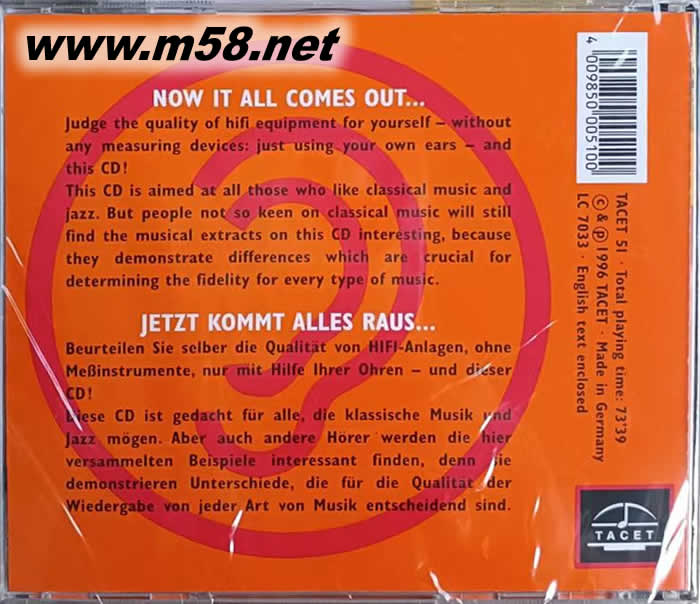 我的發(fā)燒寶典MY AUDIOPHILE COMPANION FOR CLASSICAL MUSIC AND JAZZ LOVERS(m58.net) 這是全世界第一張由德國錄音師親自設計、制作,可以適合各階層人士使用的音樂測試片。 全片內容分成兩大部分,第一部分是綜合測試,包括音響選購導引認識自己音響系統(tǒng)的實力、了解自己器材的聲音走向、甚至可以運用在多媒體計算機中。第二部分完全是針對音響迷設計的,包括教你認識模擬與數(shù)字的差異、考驗音響系統(tǒng)的再現(xiàn)能力、分辨各種A/D轉換器的不同,還有一些音響小秘方。這張唱片的內容原來是TACET老板的私房菜,他在判斷、調整錄音器材時經常用得到,如今,這份寶典也可以變成你的! 這張唱片是一張設計特殊的音響測試片,發(fā)燒友不需要透過儀器或訊號來檢是自己的音響系統(tǒng),只需要透過Tacet安排好的美妙音樂,就可輕松地透過耳朵,知道自己的音響有什幺「衰聲」的疑難雜癥。片中七個測試重點包括有,左右聲道是否接反、相位問題、動態(tài)范圍、系統(tǒng)噪音、是否聽到失真、頻率響應等等,對任何一位音響迷來說,是兼具實用與欣賞的音響檢視CD。 整張唱片的設計,都環(huán)繞著Tacet的錄音哲學,Tacet認為一張好錄音必須有四個條件:麥克風接收正確的聲音、錄音技術不扭曲原音、演奏呼吸不應被剪輯打斷、杰出的音樂家風格。 第一部分 重點Ⅰ 左右聲道相反了嗎? 重點Ⅱ 你聽到的聲音+/-相位確嗎? 重點Ⅲ 你聽到的聲音動態(tài)受到壓抑嗎? 重點Ⅳ 你的音響系統(tǒng)有雜音嗎? 重點Ⅴ 兩支喇叭的音量一樣嗎? 重點Ⅵ 你聽得到任何失真嗎? 重點Ⅶ 頻率響應測試,你的音響有染色嗎? CD唱盤讀取速度測試 第二部分 :有關錄音、混音過程時各種數(shù)據(jù)、項目不同變化