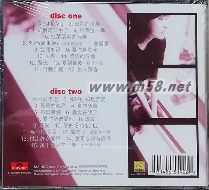 disc one 01. C est la Vie 02. 出嫁的清晨 03. 也許應(yīng)該分手了 04. 只等這一季 05. 紅葉落索的時(shí)候 06. 知已(廣東版) -邰正宵合唱 07. 會錯(cuò)意 08. 紅顏知已 09. 要你喜歡我 10. 假裝 11. 感情的分禮 12. 留戀 13. 愛到最后 -黎明合唱 14. 自動自覺 15. 動人黃昏 disc two 01. 天荒愛未老 02. 如果你知我苦衷 03. 孤單的心痛 04. 自作多情 05. 冬日浪漫 06. 真愛在明天 07. 愛你多過愛他 08. 流言 09. 最愛 10. 戀曲Sha La La 11. 癡心換情深 12. 情未了 -黃凱芹合唱 13. 付出許多愛情 14. 怎可以沒有感情 15. 萬千寵愛在一身 -李克勤合唱