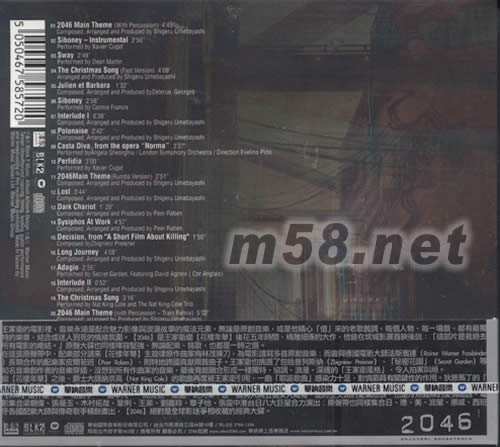 王家衛的電影里,音樂永遠是配合魅力影像與浪漫故事的魔法元素,無論是原創音樂,或是他精心‘借’來的老歌舊調,每個人物、每一場戲,都有最獨特的樂章,結合成迷人到死的情緒氛圍。《2046》是王家衛繼《花樣年華》后花五年時間、精雕細琢的大作,他曾在坎城影展首映后說:‘這部片是我過去所有電影的總結。’原聲大碟也同樣陣容堅強,無論配樂、挑歌,也都是一時之選。