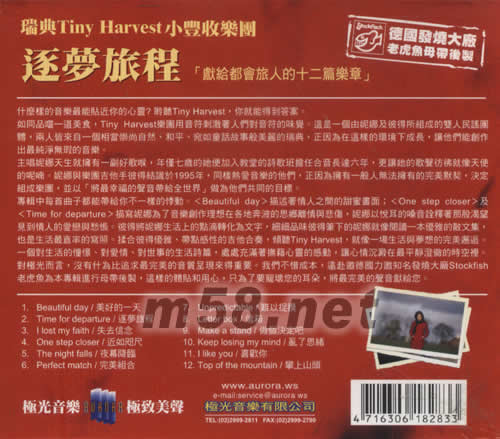 逐夢(mèng)旅程 瑞典小豐收樂(lè)團(tuán)(m58.net) 逐夢(mèng)旅程 小豐收樂(lè)團(tuán)[漫步在清晨的鄉(xiāng)間小道暖暖的陽(yáng)光灑落來(lái)自樹(shù)林的風(fēng)迎面徐徐吹來(lái)。身旁有你,旅程不再孤寂] 遠(yuǎn)赴德國(guó),力邀國(guó)際知名發(fā)燒大廠老慮魚(yú)母帶后制 什么樣的音樂(lè)最能貼近你的心靈?聆聽(tīng)TINY HARVEST,你就能得到答案。 如同品嘗一首美食,TINY HARVEST樂(lè)團(tuán)用音符刺激著人們對(duì)音符的味覺(jué)。這是一個(gè)由妮娜及彼得所組成的雙人民謠團(tuán)體,兩個(gè)皆來(lái)自一個(gè)相當(dāng)崇尚自然、和平、宛如童話故事般美麗的瑞典,正因?yàn)樵谶@樣的環(huán)境下成長(zhǎng),讓他們能創(chuàng)作出最純凈無(wú)瑕的音樂(lè)。 主唱妮娜天生就擁有一副好歌喉,年僅七歲的她便加入教堂的詩(shī)歌班但任合音長(zhǎng)達(dá)六年,更讓她的歌聲彷佛就像天使的呢喃。妮娜與樂(lè)團(tuán)吉他手彼得結(jié)識(shí)于1995年,同樣熱愛(ài)音樂(lè)的他們,正因?yàn)閾碛幸话闳藷o(wú)法擁有的完美時(shí)默契,決定組成樂(lè)團(tuán),并以[將最幸福的聲音帶給全世界]做為他們共同的目標(biāo)。 專(zhuān)輯中每首曲子都能帶給你不一樣的悸動(dòng)。(BEAUTIFUL DAY)描述著情人之間的甜蜜畫(huà)面;(ONE STEP CLOSER)及(TIME FOR DEPARTURE)描寫(xiě)妮娜為了音樂(lè)創(chuàng)作理想在各地奔波的思鄉(xiāng)離情與悲傷,妮娜以悅耳的嗓音詮釋著那股渴望見(jiàn)到情人的愛(ài)戀與愁?lèi)潯1说脤⒛菽壬钌系狞c(diǎn)滴轉(zhuǎn)化為文字,細(xì)細(xì)品味彼得筆下的妮娜就像閱讀一本優(yōu)雅的散文集也是生活最直率的這與照。揉合彼得優(yōu)雅、帶點(diǎn)感性的吉他合奏,傾聽(tīng)TINY HARVEST,就像一場(chǎng)生活與夢(mèng)想的完美邂逅。一個(gè)對(duì)生活的憧憬、對(duì)愛(ài)情、對(duì)世事的生活詩(shī)篇,處處充滿(mǎn)著撫藉心靈的感動(dòng),讓必情沉淀在最平靜澄徹的時(shí)空里。對(duì)極光而言,沒(méi)有什么為比追求最完美的音質(zhì)呈現(xiàn)來(lái)得重要。我們不惜成本,遠(yuǎn)赴邀德國(guó)力邀知名發(fā)燒大廠STOCKFISH老虎魚(yú)為本專(zhuān)輯進(jìn)行母帶后制這樣的體貼和用心,只為了要寵壞您的耳朵,將最完美的聲音獻(xiàn)給您。