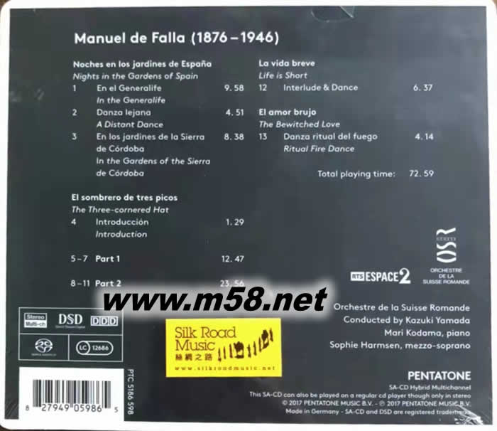 德•法利亞 [西班牙庭院之夜/三角帽/生命苦短/迷惑之愛]De Falla [Nights in the Gardens of Spain / The Three-Cornered Hat / Life is Short / The Bewitched Lov SACD(m58.net) 法雅:西班牙花園之夜、三角帽、生命苦短、迷惑之愛,瑞士羅曼德交響樂團(SACD),專輯收集了法雅最具影響力的作品,精美的管弦樂、令人振奮的旋律和節奏充滿魅力。德國壓制! Kazuki Yamada (conductor)、Mari Kodama (piano)、 Sophie Harmsen (mezzo-soprano)、Orchestre de la Suisse Romande 1. 西班牙近代最具代表性的作曲家德•法利亞(Manuel de Falla)以巧妙應用安達盧西亞(Andalucía)風格但又不受其束縛於他的作品之中見稱,因他與德彪西(Claude Debussy)及拉威爾(Maurice Ravel)的交往,其音樂也帶點印象主義(impressionism),而[西班牙庭院之夜(Nights In The Garden of Spain)]、[三角帽(The Three-cornered Hat)、[生命苦短(Life Is Short)]和[迷惑之愛(The Bewitched Love]就藴藏著這些特別元素,亦充份顯示作曲家橫溢的音樂天份和他作品的特性。 2. 第51屆國際青年指揮大賽(International Competition for Young Conductors)"首獎得主山田和樹 (Kazuki Yamada)與”瑞士羅曼德交響樂團(Orchestre de la Suisse Romande)有不少的合作,並已建立心有靈犀般的默契,這次再度合作,樂團在指揮悉心帶領下將德•法利亞數首最具影響力的作品發揮得淋漓盡致,精美的管弦樂色彩和令人振奮的旋律和節奏,充滿迷人魅力,使人回味。 3. 日籍鋼琴家兒玉麻里(Mari Kodama)那如大珠小珠落玉盤的琴音,與及女中音蘇菲•哈姆森(Sophie Harmsen)甜潤飄逸的嗓音,栩栩如生地將德•法利亞的作品的風貌和神韻重現。