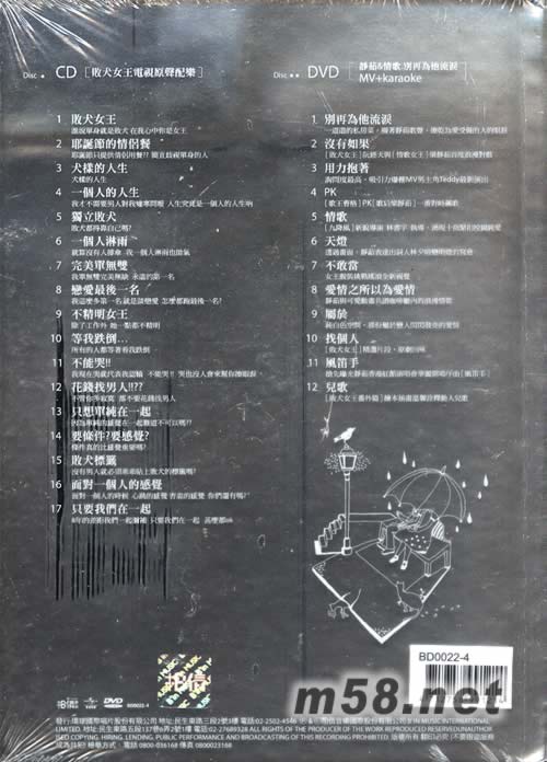 CD - 敗犬女王之情歌無雙電視劇原聲配樂 1. 敗犬女王 2. 耶誕節的情侶餐 3. 犬樣的人生 4. 一個人的人生 5. 獨立敗犬 6. 一個人淋雨 7. 完美單無雙 8. 戀愛最后一名 9. 不精明女王 10. 等我跌倒 11. 不能哭 12. 花錢找男人!!?? 13. 只想單純在一起 14. 要條件?要感覺? 15. 敗犬標籤 16. 面對一個人的感覺 17. 只要我們在一起 DVD - [靜茹&情歌.別再為他流淚]專輯MV+ karaoke全收錄 1. 別再為他流淚 2. 沒有如果 3. 用力抱著 4. PK 5. 情歌 6. 天燈 7. 不敢當 8. 愛情之所以為愛情 9. 屬於 10. 找個人 11. 風甶手 12. 兒歌