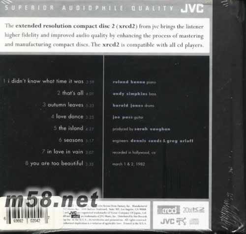 CRAZY AND MIXED UP XRCD(m58.net) Sarah Vaughan(1924-1990)是最早深諳Bebop技巧的歌手,同時(shí)又因她擁有四個(gè)八度的寬廣音域,可供任意揮灑的絕色歌喉,她也幾乎是突破樂器表達(dá)極限的唯一歌手,所有這些天賦與才華,使她只要開口即是天賴,然而她最可貴的地方恰恰是從不故意炫耀,因而她演繹過的Autumn in New York, Lover Man至今仍是無法超越的經(jīng)典。