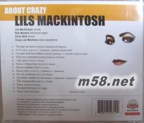 價格為估,以實到貨為準! About Crazy(m58.net) Lils Mackintosh是荷蘭最著名的爵士女歌手,出道超過廿件,灌錄唱碟10多張,演唱經非常豐富,在當年無人不識,自1993年出版的(It’s not perfect to be easy)專輯后,立刻轟動荷蘭爵士音樂界,更被讚譽為是「歐洲的 Billie Holiday」。1999年,她出版了一張獻給美國傳奇藍調結他歌手Huddie Ledbetter的專輯(Black Girl),藉此贏得2000年荷蘭一年一度最重要的「荷蘭愛迪生爵士樂大獎」。 發燒友最熟悉Lils Mackintosh的專輯,必定是2002年她於發燒名廠STS Digital旗下出版的ln The Wee Small Hours of the Morning SACD,即是綠色封面右邊有Kharma極品級揚器的一張碟,也是STS Digital廠牌早期出版的Essence of Music系列發燒大碟,碟內收錄的一首Summertime的 Lils渾厚沙啞嗓音,充滿濃郁迷人韻味,與樂聲清晰自然效果的極致優越Hi End聽感,匹配吸引得無可置疑,還有一張 Beets Brothers Live in Holland亦有Lils Mackintosh作嘉賓,演唱數首高歌曲,其精彩出色歌藝今人至今難忘。 事實上,Lils Mackintosh的歌聲除了像Billie Holiday之外,她的歌藝特別出色,歌腔韻味醉人,感情自然,魅力強盛。多年以來,她都有自己的樂隊班底,跟她到處演出,每到演唱之處俱座無虛席,近年來,她更拍電影、演歌劇甚至開班授徒教唱歌,廣泛受歡迎。 About Crazy是Lils Mackintosh最新出版的動人爵士樂錄音,音樂部分由3位老拍擋負責,他們分別是Rob Mosten彈organ、Clous van Mechelen吹色士風及Chris Strik打鼓。全碟以第14首經典著名金曲,大部分的旋律都熟悉,新編音樂風格揉合了爵士樂、藍調以及一些搖滾樂持色,充滿激情動人元素,Lils的演繹水準極之高,奔放自然動人,當中包括The Way We Were、Stormy Weather、Ain’t No Sunshine、Some Of These Days、You Know I Would、This Masquerade以及Crazy等等,全都吸引至極,加上細緻鮮明的發燒錄音和製作,更加值得女聲發燒友欣賞。