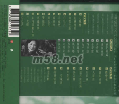 CD 1 01. 心酸酸 02. 初戀情形 03. 南都夜曲 04. 白牡丹 05. 月夜愁 06. 春宵吟 07. 雨夜花 08. 雙雁影 09. 河邊春夢 10. 心內事無人知 11. 月夜嘆 12. 心茫茫 CD 2 01. 春花望露 02. 滿面春風 03. 黃昏城 04. 牛犁歌 05. 四季謠 06. 阮不知啦 07. 姊妹愛 08. 桃花鄉 09. 春宵夢 10. 六月茉莉 11. 西北雨 CD 3 01. 蝶戀花 02. 我的青春 03. 天清清 04. 日日春 05. 送君珠淚滴 06. 欲怎樣 07. 青春嶺 08. 三步珠淚 09. 港邊惜別 10. 送出帆