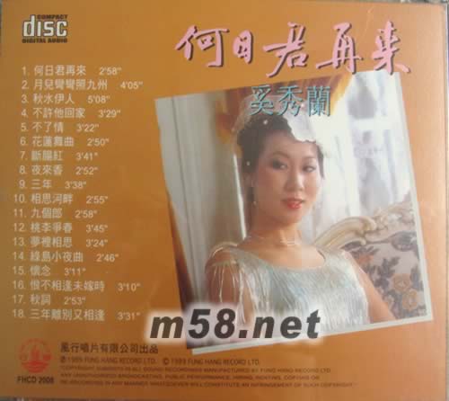 01. 何日君再來 02. 月兒彎彎照九州 03. 秋水伊人 04. 不許他回家 05. 不了情 06. 花蓮舞曲 07. 斷腸紅 08. 夜來香 09. 三年 10. 相思河畔 11. 九個郎 12. 桃李爭春 13. 夢里相思 14. 綠島小夜曲 15. 懷念 16. 恨不相逢未嫁時 17. 秋詞 18. 三年離別又相逢