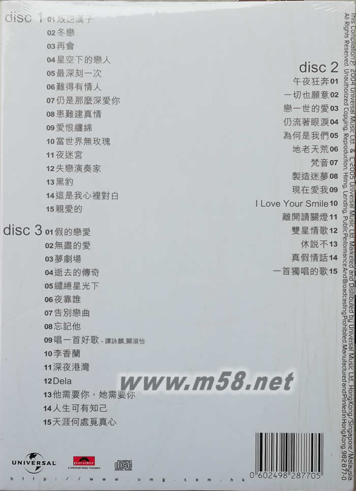 Disc 1 01. 叛逆漢子 02. 冬戀 03. 再會 04. 星空下的戀人 05. 最深刻一次 06. 難得有情人 07. 仍是那麼深愛你 08. 患難建真情 09. 愛恨纏綿 10. 當世界無玫瑰 11. 夜迷宮 12. 失戀演奏家 13. 黑豹 14. 這是我心裡對白 15. 親愛的 Disc 2 01. 午夜狂奔 02. 一切也愿意 03. 戀一世的愛 04. 仍流著眼淚 05. 為何是我們 06. 地老天荒 07. 梵音 08. 製造迷夢 09. 現在愛我 10. I Love Your Smile 11. 離開請關燈 12. 雙星情歌 13. 休說不 14. 真假情話 15. 一首獨唱的歌 Disc 3 01. 假的戀愛 02. 無盡的愛 03. 夢劇場 04. 逝去的傳奇 05. 繾綣星光下 06. 夜靠誰 07. 告別戀曲 08. 忘記他 09. 唱一首好歌 (關淑怡,譚詠麋) 10. 李香蘭 11. 深夜港灣 12. Dela 13. 他需要你,她需要你 14. 人生可有知己 15. 天涯何處覓真心