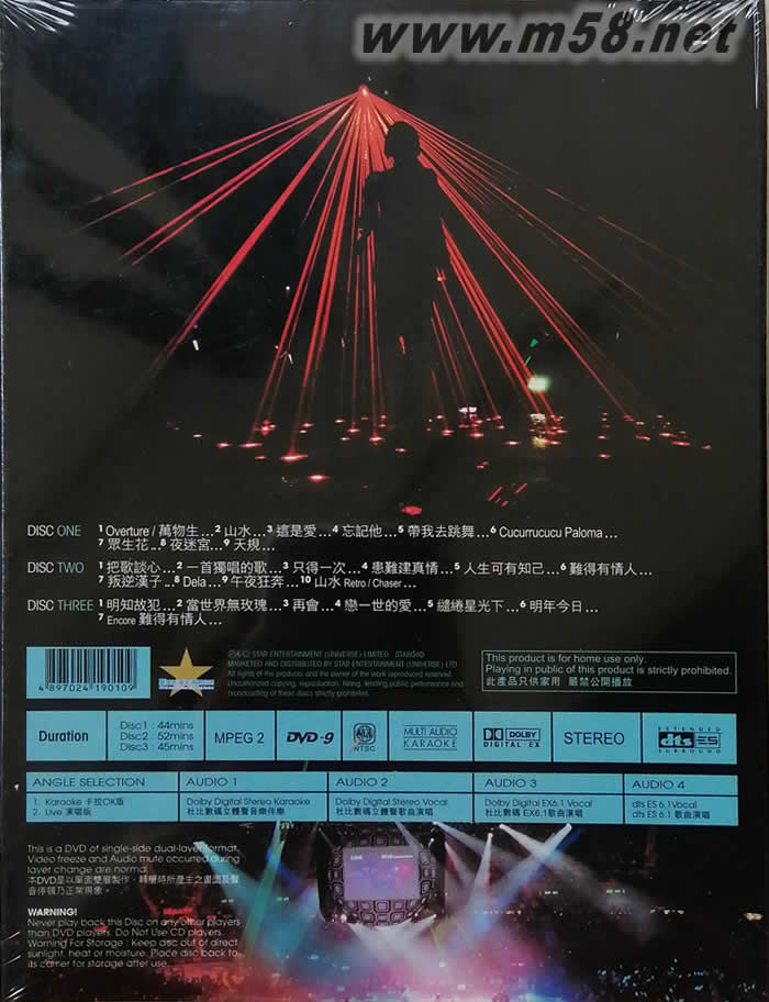 關(guān)淑怡演唱會2008 Karaoke (3DVD)(m58.net) 闊別十年樂壇的關(guān)淑怡,2005年再次復(fù)出,而最近一次與歌迷見面為2008年4月24日在香港紅館舉行一連兩場的《Unexpected Shirley Kwan in concert》。以「unexpected」為演唱會的主題,Shirley 配合了主題玩神秘,以梵音「萬物生」甫出場;這位歌后性感迷幻集一身,施展渾身解數(shù),換了由名設(shè)計師 Tomas Chan 炮制的多套舞衣,為歌迷們帶來無限的驚喜。 關(guān)淑怡在個唱之中嘗試新的音樂風(fēng)格,且引入了新鮮的元素,更勝2006年的《關(guān)于我 關(guān)淑怡演唱會》。除了演繹不同的經(jīng)典金曲如「叛逆漢子」、「難得有情人」、「繾綣星光下」和「夜迷宮」,她翻唱了許美靜的「明知故犯」,并配合《春光乍洩 - 攝氏零度》的畫面下高唱西班牙語的「Cuccuruccu Paloma」。Shirley 在舞臺上更首次現(xiàn)場演唱最最新單曲「山水」、「天規(guī)」,以及《十二金釵眾生花》專輯主題曲「眾生花」和人氣處景電視劇《同事三分親》的片尾曲「只得一次」。 首批《關(guān)淑怡演唱會2008》卡拉OK DVD以兩款封面發(fā)售。