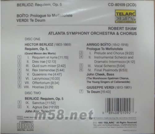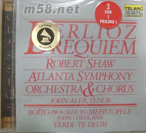 柏遼茲 安魂曲(m58.net) 氣勢(shì)懾人的合唱聲響 以《幻想交響曲》被愛(ài)樂(lè)者所熟知的浪漫派標(biāo)題音樂(lè)大師白遼士,《安魂曲》是其另一重要之代表作,作曲家使用了大樂(lè)團(tuán)及大合唱團(tuán)的編制,營(yíng)造出歌曲所蘊(yùn)含的肅穆崇敬之氣氛,《末日經(jīng)》中聲勢(shì)懾人之銅管音響,令人不免對(duì)死亡寒顫不已。十九世紀(jì)末的義大利作曲家兼劇作家包伊多,曾為威爾第寫(xiě)過(guò)《奧泰羅》及《法斯塔夫》之劇本,懾人的合唱與樂(lè)團(tuán)的默契皆為十分完美之組合。歌劇《梅菲斯多菲》是包伊多人聲樂(lè)曲之代表,風(fēng)格近似威爾第,為典型的義大利式歌劇。羅伯‧蕭以詮釋合唱曲之功力被譽(yù)為當(dāng)今合唱音樂(lè)界之泰斗,名曲輔以發(fā)燒級(jí)人聲錄音之名碟,愛(ài)樂(lè)者不容錯(cuò)過(guò)!榮獲TAS、葛萊美獎(jiǎng)及三星帶花名盤(pán)。