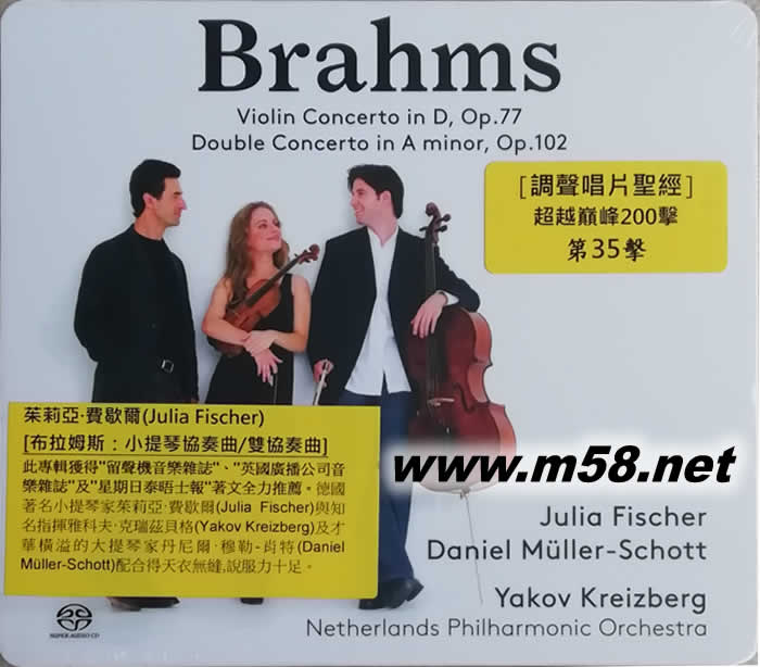 布拉姆斯:小提琴協(xié)奏曲/雙協(xié)奏曲](Brahms: Violin Concerto Double Concerto 小提琴與大提琴 SACD (劉漢盛推介 超越巔峰200擊入圍CD)(m58.net) Julia Fischer (violin)、 Daniel Müller-Schott (cello)、 Yakov Kreizberg (conductor)、 Netherlands Philharmonic Orchestra 1. 德國著名小提琴家茱莉亞•費(fèi)歇爾(Julia Fischer)與美籍 俄羅斯裔知名指揮雅科夫•克瑞茲貝格(Yakov Kreizberg) 合作良久,配合荷蘭愛樂樂團(tuán)將布拉姆斯的小提琴協(xié)奏曲 每一個(gè)細(xì)節(jié)的演繹都充滿節(jié)奏和戲劇性,熾熱但不浮躁, 內(nèi)斂卻輕快抒情。 2.才華橫溢的德國年輕大提琴家丹尼爾•穆勒-肖特(Daniel Müller-Schott)演奏有若柔絲般的順滑,優(yōu)雅別致,與費(fèi)歇 爾配合得天衣無縫,說服力十足。 3. 專輯獲得"留聲機(jī)音樂雜誌(Gramophone Magazine)"、 "英國廣播公司音樂雜誌(BBC Music Magazine)"及"星期日泰晤士報(bào)(Sunday Times)"著文全力推薦。