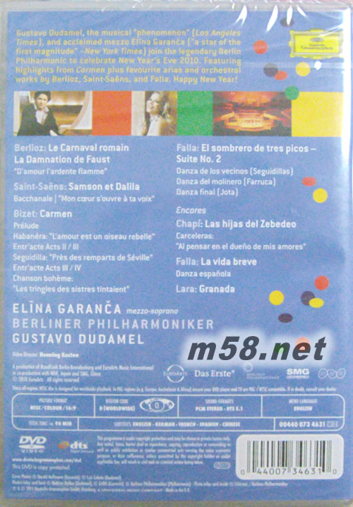 2010年柏林愛樂除夕音樂會 Silvesterkonzert: New Year's Eve Concert 2010 DVD(m58.net) 指揮:GUSTAVO DUDAMEL 女高音:ELINA GARANCE 16:9 PCM Stereo / DTS 5.1 約90分鐘 德/英/西/法/中 簡介: 除了維也納愛樂的新年音樂會,柏林愛樂每年舉辦的除夕音樂會,也是愛樂者每年引頸盼望的音樂盛事之一。在2010年的音樂會里,柏林愛樂邀請了現在國際上最炙手可熱的兩位年輕音樂家:來自拉脫維亞的次女高音嘉蘭莎,以及來自委內瑞拉的指揮杜達美。 在這一場音樂會里,嘉蘭莎在杜達美的指揮下,演唱了白遼士《浮士德的天譴》〈燃燒愛情之火〉、圣?!秴O與達麗拉》〈你的聲音開啟我的心扉〉、比才《卡門》〈愛情像一只自由的小鳥〉、〈在塞維亞附近的城墻〉與〈敲打著響板〉等歌劇選粹,以及西班牙作曲家恰皮《杰伯迪歐的女兒們》〈Al pensar〉、作曲家奧古斯汀‧拉拉的名曲《格拉納達》。杜達美則與柏林愛樂演出了白遼士《羅馬狂歡節》序曲、圣桑《參孫與達麗拉》〈酒神之舞〉、比才《卡門》前奏曲、法雅《三角帽》里的三首舞曲、《人生苦短》的西班牙舞曲等樂曲。 杜達美曾說:「我從小就開始跳舞,學習如何跳舞本來就是我們(委內瑞拉)文化的一部分,血液里都有舞蹈的因子」,因此他的音樂一向以具有魔力般的節奏性,深得愛樂者的喜愛;而對於西班牙的一切十分著迷的嘉蘭莎,也以她純凈的音色,以及對於任何困難的演唱段落都能輕鬆駕馭的技巧,剛推出一張受到極度好評的西班牙專輯。兩人的合作,為愛樂者帶來一場走出德奧,呈現出完全不一樣的古典音樂之夜。