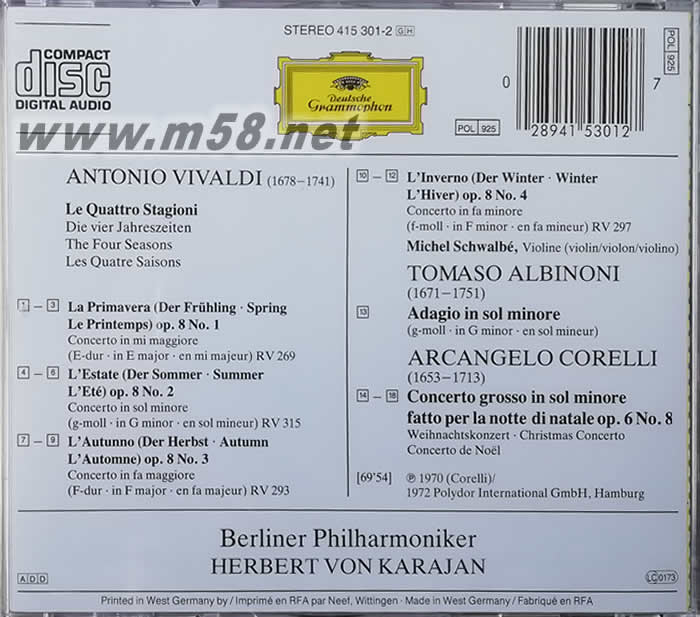 Vivaldi: The Four Seasons 維瓦爾第:四季(m58.net) 這套《維瓦爾第:四季》由DG唱片公司發行于1985年,由小提琴家Michel Schwalbé擔任主奏,赫伯特?馮?卡拉揚指揮柏林愛樂樂團演奏錄制。 安東尼奧?維瓦爾第(Antonio Vivaldi,約1675-1741)是巴羅克時期意大利著名的作曲家、小提琴家。自幼學習小提琴與作曲,1714年起任威尼斯貧女音樂學校教師及樂長。除作有大量由一把小提琴及樂隊來演奏的小提琴協奏曲外,尚作有不少用兩至四把小提琴或木管樂器來演奏的協奏曲和實為管弦樂重奏曲的大等,以富于民間色彩和生活氣息著稱。此外,還作有歌劇十余部,以及康塔塔、經文歌、三重奏鳴曲、奏鳴曲等。他最著名的作品是小提琴協奏曲《四季》。他的音樂天才啟迪了后來的巴羅克大音樂家,尤其是他豐富的作品和新穎的、科學的歌劇創作方法,刺激了現代意大利作曲家的好奇心。 維瓦爾第的小提琴協奏曲《四季》作品大約作于1725年,是維瓦爾第大約五十歲時出版的十二部協奏曲的第一號到第四號,合稱《四季》。這四部協奏曲是維瓦爾第最著名的作品,其中的旋律至今仍長盛不衰。四部作品均采用三樂章協奏曲形式的正宗標題音樂,不僅照給定的十四行詩配上音樂,而且還運用了不少描寫手法。維瓦爾第在總奏與主奏交替形成的復奏形式上,巧妙地配以標題。在維瓦爾第之前,還沒有人以標題音樂的方式譜寫過協奏曲。由于維瓦爾第的《四季》屬于標題音樂,所以從形式上看,自然較其他協奏曲顯得自由而且不平衡,但這樣反而更能表現出巴洛克的特色及魅力。這四部作品畫意盎然,激發出人們對巴洛克時代音樂的濃厚興趣。 赫伯特?馮?卡拉揚(Herbert von Karajan)為偉大的奧地利指揮家。自幼學鋼琴,曾進維也納音樂學校和薩爾茲堡的莫扎特音樂學院學習。他的指揮生涯先從小城烏爾姆開始,1938年被聘為柏林歌劇院的指揮,1947年任維也納愛樂樂團和維也納樂友協會管弦樂隊指揮,1949年起兼任米蘭?斯卡拉歌劇院常任指揮,1950年兼任倫敦愛樂樂團常任指揮,1955年起任柏林愛樂樂團的終身常任指揮,1956年任維也納國立歌劇院的音樂總指導。他是現代最著名的指揮家之一,人們稱他為“歐洲音樂的總指導”。他也是拜羅伊特、薩爾茲堡音樂節的主要人物。1967年開始主辦他個人的音樂節—復活節音樂周。 卡拉揚的指揮動作灑脫、大方、氣勢磅礴,并以準確和客觀著稱。卡拉揚有驚人的指揮技巧,與樂隊的配合如水乳交融般天衣無縫,通過熱情洋溢、奔放豪邁的演奏,將音樂準確而強有力地傳達給聽眾。他擅長在忠實于原作的基礎上,對作品進行精雕細刻、巧妙布局,甚至適度夸張,而這一切都圍繞著塑造完美的音樂形象而進行。在指揮臺上卡拉揚經常閉目深思,使得樂隊各聲部之間達到了演奏室內樂般的默契。在他的領導下,柏林愛樂樂團展現出了一種有如金屬般的亮色,被譽為卡拉揚“音響”。卡拉揚指揮時不僅自己全身心投入音樂之中,而且還善于啟發樂隊隊員,使他們懂得如何演奏,用魔法般的動作牢牢吸引住樂隊。他所追求的目標就是,“把托斯卡尼尼的精確與富爾特文格勒的幻想結合在一起”。正是他的音樂天賦,加上對樂曲的正確理解和對樂隊的嚴格要求,他的演出總能達到超常出眾的藝術水平。