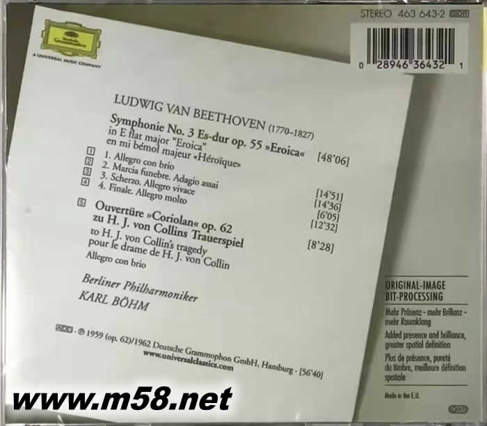 貝多芬 第三號交響曲 英雄 Karl Bohm - Beethoven: Symphony No. 3 CD (大禾花版)(m58.net) 這套卡爾?貝姆指揮柏林愛樂樂團演出灌錄的《貝多芬:No. 3英雄交響曲》,DG公司2001年出版發行。 貝多芬集古典音樂的大成,同時開辟了浪漫時期音樂的道路,對世界音樂的發展有著舉足輕重的作用,被尊稱為“樂圣”。貝多芬的降E大調第三交響曲《英雄》完成于1804年春,本欲獻給法國第一位執政者拿破侖,但當得知拿破侖將于五月十八日即位皇帝時,貝多芬立刻將總譜寫有題詞的封面撕下,并憤怒地高喊:“這是一個獨裁者!”后來出版時他將標題改為“為紀念一位偉大的英雄而作”。這部作品于1805年在維也納初演一舉成功,從此貝多芬蜚聲于歐洲樂壇。 降E大調第三交響曲《英雄》是貝多芬最著名的代表作之一,是第一部打破維也納交響樂模式,完全體現英雄性格的作品。作品貫穿著嚴肅和歡樂的情緒,始終保持著深沉、真摯的感情,呈現出強烈的浪漫主義氣氛。貝多芬本人曾聲稱他最喜歡的交響樂就是這部第三交響曲。 卡爾?貝姆(1894-1981)是奧地利指揮家,生于奧地利,1927-1931年赴達姆斯塔特任首席指揮,其間于1928年指揮首演貝爾格歌劇《沃采克》,此后貝姆便成為《沃采克》和《璐璐》的權威詮釋者。1934-1943年間貝姆出任德累斯頓歌劇院音樂監督,其間又指揮首演了施特勞斯的《沉默的女人》和《達夫妮》(此劇乃作曲家題贈貝姆),以及施特勞斯此后所作主要管弦樂作品和歌劇。戰后貝姆重登指揮臺,50年代曾指揮維也納國家歌劇院,后來成為自由之身,基本上是個錄音指揮家,主要與維也納愛樂樂團和柏林愛樂樂團合作在DG錄制唱片,數量龐大。