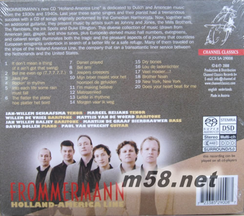 荷蘭—美國(guó)的連系 (Holland-America Line) SACD(m58.net) 德國(guó)弗羅梅曼合唱團(tuán)”Frommermann”是創(chuàng)辦人哈里.弗羅梅曼(Harry Frommermann)於1927年成立此喜劇演員合唱團(tuán)時(shí)以此命名,2004年12月高音歌唱家韋因斯(Marcel Reijan)將合唱團(tuán)重組。最新專輯由七位成員以簡(jiǎn)單的鋼琴、低音結(jié)他及結(jié)他伴奏配上充滿動(dòng)感、千變?nèi)f化以人聲模仿的樂器聲合成的絕技演唱多位著名美國(guó)作曲家的歌曲名作包括艾靈頓公爵(Duke Ellington)、班.奧克蘭(Ben Oakland)、菲歐.馬科埃本(Theo Mackeben)、伯恩斯坦(Leonard Bernstein)、詹姆士.魏靈頓.強(qiáng)森(James Weldon Johnson)與及哈里.華倫(Harry Warren)等,將美國(guó)音樂史上最重要的作品逐一復(fù)現(xiàn),經(jīng)專業(yè)無瑕的SACD製作后,人聲更為立體、豐富、清晰分明,是歌唱作品的示范首選!
