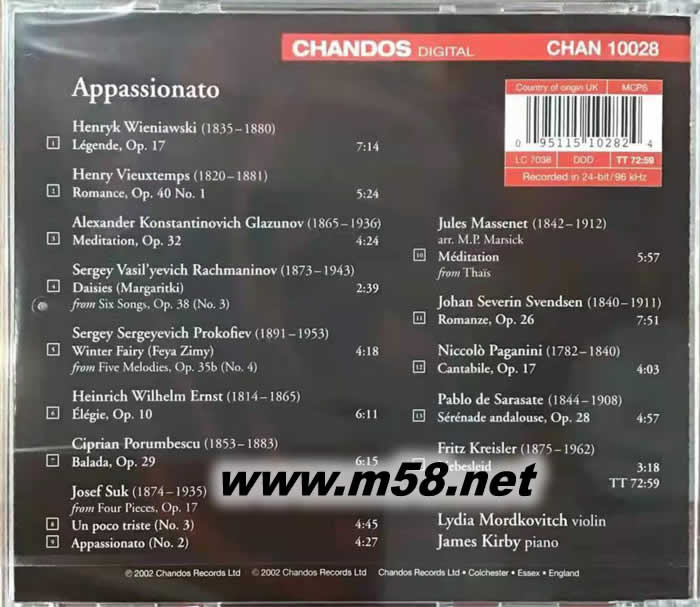 小提琴之愛 APPASSIONATO 激情(m58.net) 小提琴巨擘大衛(wèi)歐伊斯特拉赫第一女弟子精彩演繹 收錄多首罕有小提琴經(jīng)典小品 音樂質(zhì)感一流;音色溫暖通透 英國(guó)原裝進(jìn)口