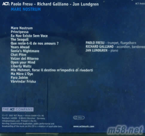 1. Mare Nostrum 2. Principessa 3. Eu Nao Existo Sem Voce 4. Seagull, The 5. Que Reste-T-Il de Nos Amours? 6. Years Ahead 7. Sonia's Nightmare 8. Chat Pitre 9. Valzer del Ritorno 10. Open Your Mind 11. Liberty Waltz 12. Mio Mehmet, Forse il Destino M'Impedirà di Rivederti 13. Ma Mère l'Oye 14. Para Jobim 15. Vårvindar Friska