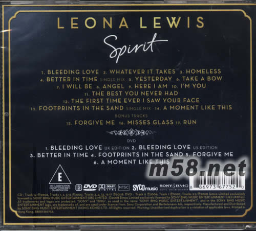 Spirit (THE DELUXE DEITION)(m58.net) 這位愛唱的的小妮子Leona Lewis,她的音樂傳奇故事已經(jīng)在英國迅速蔓延,銳不可擋的往國際舞臺延燒。成為英倫歌唱選秀節(jié)目The X Factor第三季冠軍而展露頭角,翻唱Americn Idol美國偶像第一季冠軍Kelly Clarkson凱莉克萊森的成名曲”A Moment Like This”,以網(wǎng)路下載的形式搶先發(fā)行,立刻在30分鐘內(nèi)被下載五萬次,入主最新金氏世界紀(jì)錄,打破有史以來銷售最快的單曲成績,第一個禮拜便開出 571,253張驚人紅盤,短短不到兩個禮拜,即穩(wěn)穩(wěn)佔(zhàn)據(jù)2006年全英整年度銷售第二名位置。 Leona的魅力席捲整個歐洲外,就連美國都看好這塊瑰寶,捧紅惠妮休斯頓、艾莉西亞凱斯等巨星的音樂界教父Clive Davis,以九百七十萬美金簽下Leona,準(zhǔn)備為她全力開拓美國市場,就連師姐惠妮都直夸她將成為下一位舉世矚目的國際巨星!出生於英國倫敦,混有義大利、愛爾蘭血統(tǒng)的Leona,五歲時進(jìn)入藝術(shù)院校大展與生俱來的音樂天份,12歲便開始創(chuàng)作歌曲。離開學(xué)校后,曾在比薩店當(dāng)女服務(wù)生,為了賺錢租借錄音室錄製Demo帶。當(dāng)音樂生涯四處碰壁,心灰意冷想要放棄之時,經(jīng)男友的鼓勵參加The X Factor,終於讓這位黑珍珠閃亮發(fā)光,提早預(yù)約天后寶座的席位! 比賽結(jié)束后醞釀一年時間問世《Spirit》,英美兩大巨頭 Simon Cowell和Clive Davis執(zhí)行製作,動員多位才氣音樂人齊力操盤,直接空降英國金榜冠軍,七個禮拜大破一百五十九萬張,成為英國史上銷售最快專輯第四名。第一波主打” Bleeding Love”,由美國創(chuàng)作偶像才子杰西麥卡尼,以及嘻哈界全方位製作金童Timbaland提攜的五人搖滾新貴OneRepublic主唱Ryan Tedder聯(lián)手撰寫,開賣第一天創(chuàng)下六萬六千張紀(jì)錄,霸佔(zhàn)英國金榜NO.1長達(dá)七週之久,成為英國單曲史上獲冠週數(shù)最長的女歌手;架構(gòu)在節(jié)奏藍(lán)調(diào)與弦樂輔佐之”Whatever It Takes”,后段以福音式的合音呈現(xiàn),加強(qiáng)遼闊澎湃激昂的氣流,Leona更參與此曲的創(chuàng)作;著重鋼琴演出的動聽小品”Better In Time”和”Yesterday”,真假音漂亮轉(zhuǎn)換且不耍過度花腔的演出,回歸瑪麗亞凱莉剛出道時的音質(zhì)感動,”Here I Am”更散發(fā)”Hero”時期絕美的真摯情感;包覆濃厚美式節(jié)奏藍(lán)調(diào)旋律之”Angel”,吉他不慍不火的伴隨彈奏出如同碧昂絲冠軍金曲” Irreplaceable”相似音場;輕快中板的”The Best You Never Had”,是支滿溢性感滑順且浪漫悅耳的柔性曲目;”The First Time Ever I Saw Your Face”則是翻唱靈魂樂女伶Roberta Flack於1972年締造的冠軍單曲。Leona不斷在破英國音樂史紀(jì)錄,并入選美國權(quán)威影劇雜誌娛樂週刊/Entertainment Weekly「2008年值得你關(guān)注的八位人物」之列、「2007年度最佳演出」以及「下一位瑪麗亞凱莉」等好評,毫無疑問的,這個效應(yīng)將在全球各地快速傳開!