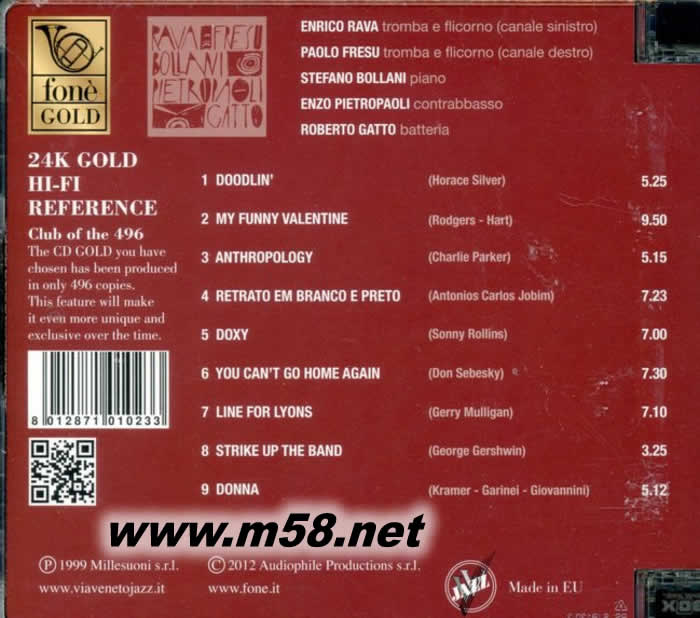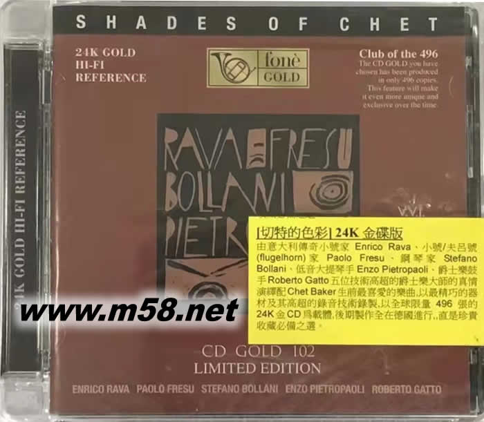 切特的色彩Shades of Chet 24K (小號) 24K金碟(m58.net) Enrico Rava, tromba e flicorno (canale sinistro) Paolo Fresu, tromba e flicorno (canale destro)、 Stefano Bollani (piano)、Enzo Pietropaoli, contrabbasso)、 Roberto Gatto (batteria) 1. 恩里科.拉瓦(Enrico Rava)是意大利傳奇的小號演奏家,他在國際爵士樂壇的地位跟切特.貝克(Chet Baker)不相伯仲,其吹奏小號的魔力顛倒一眾樂迷。 2. 天才橫溢的小號/富呂號(flügelhorn)演奏家保羅.弗蘇(Paolo Fresu)從11歲時便在卡利亞里音樂學院(Conservatory of Cagliari)受到音樂大師莫蘭迪尼(Enzo Morandini)的指導,除了演奏出色外,他亦是著名的編曲和作曲家,是爵士樂的殿堂級人物。 3. 拉瓦和弗蘇對切特.貝克推崇備致,他們聯同以演奏古典樂和爵士樂的米蘭著名鋼琴家斯特瓦諾.伯拉尼 (StefanoBollani),曾獲得意大利最具權威的“音樂雜志“(Musica Magazine)頒發之【最佳意大利爵士樂隊(Best Italian Group)】的低音大提琴手恩佐.彼特奧保尼(Enzo Pietropaoli)和出生于羅馬之著名爵士樂鼓手羅伯托.加托(Roberto Gatto)𢹂手演奏所有貝克的著名作品及其喜愛之歌曲,無論演奏風格、情調和樂風跟貝克在其黃金的五十年代時相若,動聽非常。 4. 此專輯由錄音大師里茲(Giulio Cesare Ricci)以最精巧的器材及其高超的錄音技術錄制貝克的不朽名曲,其精彩處非筆墨所能形容,首次以SACD為載體,音色溫潤平𧗾,音質清晰順滑,韻味十足的演奏,塑造出爵士樂品味經典。