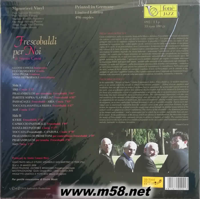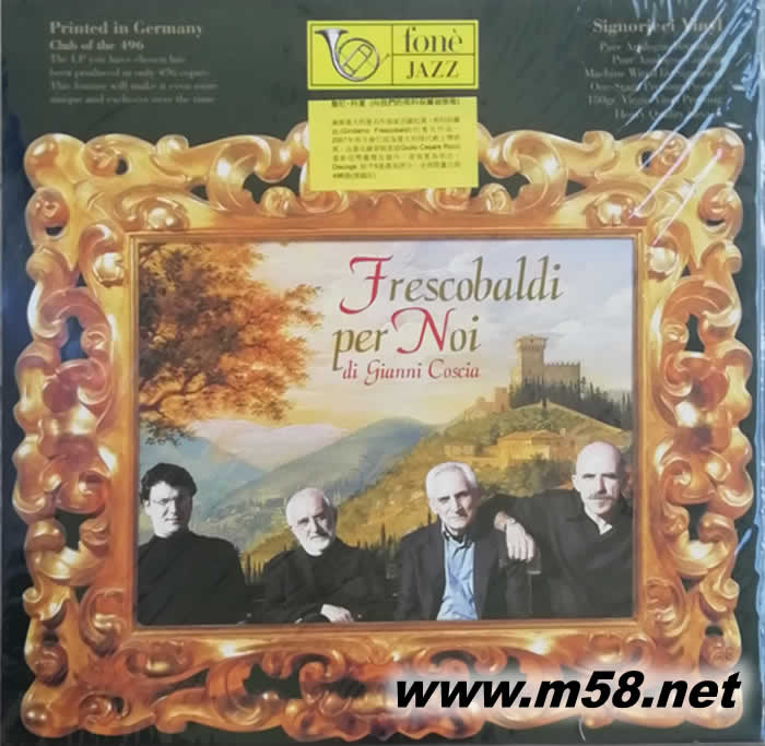 詹尼科夏[向我們的弗科保爾迪致敬] Gianni Coscia [Frescobaldi Per Noi 爵士四重奏 手風(fēng)琴 大提琴、長(zhǎng)號(hào)、小號(hào) 黑膠(m58.net) 詹尼‧科夏 (手風(fēng)琴) 恩佐‧皮埃特羅帕里 (低音大提琴) 迪諾‧皮亞納 (長(zhǎng)號(hào)) 富爾維奧‧西古爾塔 (小號(hào)) 1. 演奏意大利著名作曲家吉羅拉莫‧弗科保爾迪(Girolamo Frescobaldi)的著名作品。 2. 2007年首次發(fā)行成為意大利現(xiàn)代爵士樂(lè)經(jīng)典。 3. Discogs 給予5星最高評(píng)分。 4. 由著名錄音師里茲Giulio Cesare Ricci)重新母帶處理及提升,音效更為突出。