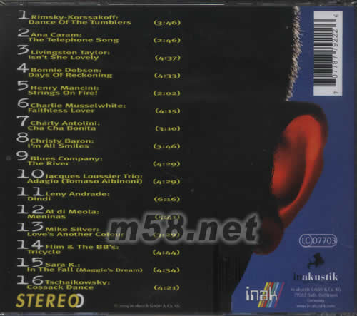 1.RIMSKY-KORSSAKOFF: DANCE OF THE TUMBLERS 2.ANA CARAM: THE TELEPHONE SONG 3.LIVINGSTON TAYLOR: ISN'T SHE LOVELY 4.BONNIE DOBSON: DAYS OF RECKONING 5.HENRY MANCINI: STRINGS ON FIRE! 6.CHARLIE MUSSELWHITE: FAITHLESS LOVER 7.CHARLY ANTOLINI: CHA CHA BONITA 8.CHRISTY BARON: I'M ALL SMILES 9.BLUES COMPANY: THE RIVER 10.JACQUES LOUSSIER TRIO: ADAGIO (TOMASO ALBINONI) 11.LENY ANDRADE: DINDI 12.AL DI MEOLA: MENINAS 13.MIKE SILVER: LOVE'S ANOTHER COLOUR 14.FLIM & THE BB'S: TRICYCLE 15.SARA K: IN THE FALL(MAGGIE'S DREAM) 16.TSCHAIKOWSKY: COSSACK DANCE