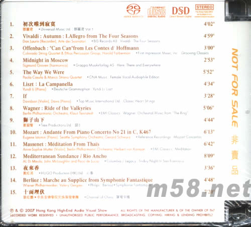 香港高級視聽展2007原音精選SACD(m58.net) 附送大會精心選輯靚聲雙層SACD《2007原音精選》一只,SACD或CD機皆可播放,內(nèi)里精選來自不同國家、廣為音響發(fā)燒友鐘愛的美妙音樂,目的旨在讓普羅大眾有機會接觸不同音樂文化及享受迫真的錄音效果