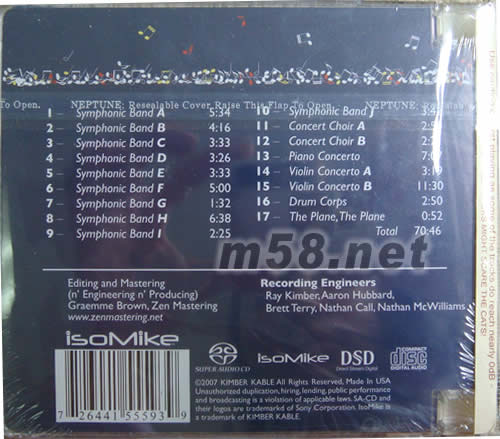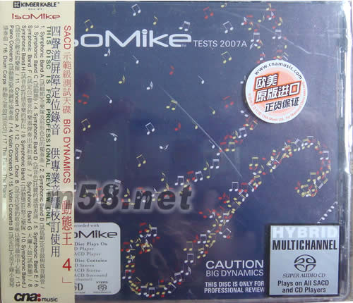 價(jià)格為估,以實(shí)到貨為準(zhǔn)! 動(dòng)態(tài)王4 SACD示范碟(m58.net) 四聲道屏障定位錄音,供專業(yè)音響校訂使用 Kimber Kable自2005年起先后推出過(guò)幾張以自家發(fā)明的lsoMike錄音系統(tǒng)錄製的示范試音碟,如果閣下一直有捧場(chǎng),不難發(fā)現(xiàn)他們的錄音動(dòng)態(tài)強(qiáng)勁之余,音色還相當(dāng)之清純,令人想起音響名器Cello的音色,而錄音師Ray Kimber亦對(duì)這個(gè)錄音人陣法掌握得越來(lái)越好,於是錄音的目標(biāo)一次比一次高難度,剛評(píng)論過(guò)的《lsoMikeTests2006》走到足球場(chǎng)錄音,這張《lsoMikeTests 2007A》更牛刀小試錄了一小段飛機(jī)於遠(yuǎn)處飛過(guò)的聲音。 今次碟中共有17個(gè)試音段,主要以交響樂(lè)為主,再加幾首鋼琴及小提琴協(xié)奏曲,不像過(guò)往只偏重合唱團(tuán)的錄音了,但大家依然不可以掉以輕心,因碟內(nèi)每cut仍採(cǎi)用低電平錄音去捕捉每一個(gè)細(xì)微的動(dòng)態(tài)所以要十分小心去調(diào)校音量。頭一段樂(lè)章只是作熱身罷了,到第二首以定音鼓及銅管樂(lè)器演奏的作品才正式開(kāi)始展示lsoMike的真正實(shí)力,尤其是最后分多鐘的動(dòng)態(tài)頗具氣勢(shì),為何用「頗具」呢?因?yàn)榻又鰣?chǎng)的兩首《Symphonic Band C及D》的動(dòng)態(tài)更為驚人。第9段的兩分半鐘充滿爆炸力,猶如狂風(fēng)掃落葉。還不夠喉的可聽(tīng)聽(tīng)第16首《Drum Corps》打到入心入人肺的擊鼓聲,低音愛(ài)好者必定過(guò)足癮!