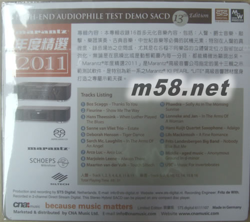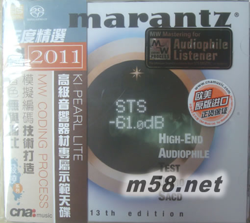 MARANTZ鑒聽王 年度精選2011 天碟第13張SACD終極示范(m58.net) MarantzR 2011年度精選】 KI PEARL LITE音響器材專屬示范天碟 模擬編碼技術打造 音色無與倫比 【MarantzR 年度精選】至今已出版到第13張,這年度精選是發燒友每年必須擁有和收藏專輯,因STS與其硬件贊助商對此十分重視,STS每年之錄音技術固然有長進,硬件贊助商也一樣新品盡出,音效保証最高。本專輯收錄16首多元化音樂,內容包括:人聲、爵士音樂、敲擊、樂器演奏、古典音樂,中世紀音樂等必備的試機元素;特別在人聲的真確度、錄音場地之空間感,各種不同樂器的立體聲和定位方面都作出強化,無論是在訊噪比或是動態范圍內每一分貝,都能精確地顯現出來?!窶arantzR年度精選2011」是MarantzR 高級音響公司指定的第十三輯之示范測試軟件,特別為全新一系之MarantzR KI PEARL “LITE” 高級音響器材度身打造之專屬SACD示范天碟。 人聲: tracks 1, 2, 3, 4, 6, 8, 11 & 13 樂器: tracks 5, 7, 9, 10, 12, 14, 15 & 16