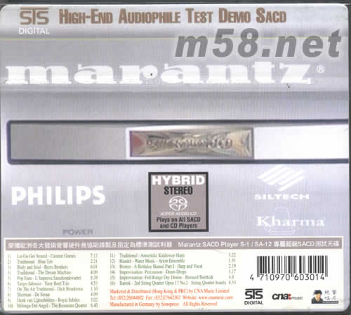 監(jiān)聽王2 SACD 終極示范級(jí)測(cè)試天碟 第六輯(m58.net) 請(qǐng)點(diǎn)看產(chǎn)品正、背面大圖 產(chǎn)品資料 荷蘭權(quán)威發(fā)燒錄音制作品牌STS-Digital,抱著一個(gè)以最忠誠(chéng)以及最完美錄音為其基礎(chǔ)目標(biāo),就是向每一位音樂愛好者及專業(yè)監(jiān)聽專家, 諾制作一系列極級(jí)發(fā)燒音樂產(chǎn)品。[監(jiān)聽王2]SACD測(cè)試音樂專輯是STS-Digital第六張與權(quán)威音響硬件制造商Miarantz命名及合作制之測(cè)試軟件,是Marantz SA-17SI SACD播放機(jī)專屬超級(jí)測(cè)試軟件。本專輯是經(jīng)由各大著名音響軟件制造商之錄音專員聯(lián)手制作及現(xiàn)場(chǎng)監(jiān)察錄制,目的就是能夠在各種不同的音響系統(tǒng)重播當(dāng)中,能發(fā)揮出其無窮無盡的潛能力量,而在音樂及樂器的傳真及結(jié)像力當(dāng)中,釋放出無限的震撼和爆力,樂器定位準(zhǔn)確無誤,聲音清澈通透;然而人類情感的深度刻劃,在歌手圓潤(rùn)甜美的聲線中完全表露無遺! 專輯內(nèi)容 本專輯收錄了18首多元化測(cè)試內(nèi)容,包括:人聲、爵士音樂、古典音樂、地方民謠、教堂合唱、敲磬音樂、吉他、大小提琴、色士風(fēng)及鋼琴聲等定位方面都加以強(qiáng)調(diào),無論是在訊噪比或動(dòng)態(tài)范圍內(nèi)每一分 貝(DB),都精確地類出來,只要小心細(xì)閱本專輯內(nèi)的小冊(cè)子內(nèi)容,附有詳細(xì)解釋每一首歌曲細(xì)微的聲、樂器中的位置子或錄音時(shí)刻留下來的記號(hào)等等,如果門閣下的音響徹云霄器材在播放此碟時(shí)不能分析出小冊(cè)子上所提及的摘要,出版商建議閣下要重新調(diào)較或有需要升級(jí)現(xiàn)有的音響器材。