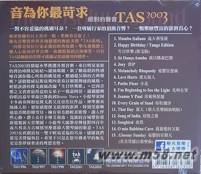 TAS 絕對(duì)的聲音CD 2003(m58.net) 一對(duì)不容妥協(xié)的挑剔耳朵?一套專屬行家的頂級(jí)音響?一顆樂歷豐富的澎真心? 如果您擁有以上其中一點(diǎn),那么恭喜了! 極光音樂從世界各地嚴(yán)選的極致美聲[TAS系列]一向都是第位行家必備的經(jīng)典收藏。舉凡發(fā)燒爵士憾人心弦的世界音樂、曲調(diào)悠揚(yáng)的古典樂等,只有TAS最極致的美聲才能滿足您最嚴(yán)苛求的標(biāo)準(zhǔn)。 TAS2003持續(xù)超水準(zhǔn)挑選各類音樂,來(lái)自明星家族的喬治庫(kù)隆尼姑姑~蘿絲瑪麗,裹了糖霜的性感嗓音讓你隨心所欲的跳曼波。聽過超另類的古典樂嗎?請(qǐng)聽聽威尼斯弦樂四重奏以顛覆傳統(tǒng)的風(fēng)格,輕松詼諧的控戈曲風(fēng)改編[生日快樂歌]。巴西音樂之父裘寶最得意的女弟子—瑪嘉阿涅,瀟灑隨與的唱出嘉年華林巴舞曲到BOSSA NOVA。小提琴家阿卡多演奏阿根廷探戈教父皮亞佐拉作品,神準(zhǔn)節(jié)奏絲絲入扣,要樂感覺探戈最深的澎特別肥度琳迪翁青睞的韓雪兒,擁有有輕柔歌聲,讓人怦然心動(dòng)。爵士女伶卡琳艾莉森,寬廣的音域帶你重新遨游新天堂樂園,小提琴大師黎奇?zhèn)鬟_(dá)對(duì)四百年意大利北方古城格里摩那偉大制琴師的敬意。TAS2003在此獻(xiàn)給每一雙不輕易妥協(xié)的耳朵,感謝我們都是美聲偏執(zhí)狂。希望不只是在您耳里希罕的極光更是您夢(mèng)寐以求奢求的理想美聲。