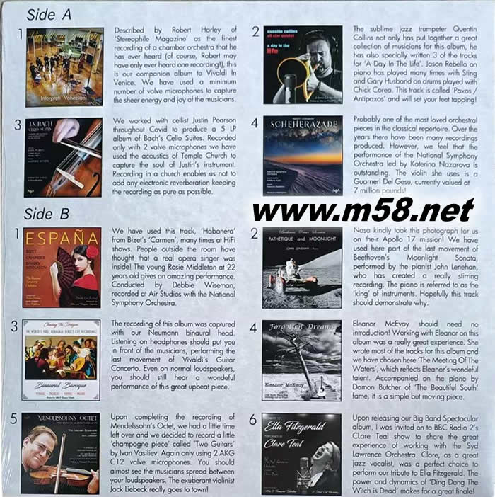 Side A: 1. Swing Band – Syd Lawrence Orchestra 2. Drum Solo Improvisation – Tim Hortons, drum kit 3. Piano – Sonata No. XV by Mozart 4. Church Organ – Bach – Toccata And Fugue In D 5. Interpreti Veneziani – Vivaldi Cello Concerto RV 419 Side B: 1. Interpreti Veneziani – Corelli Concerto Grosso Op. 6 No. 4 2. Lute – Anonymous Piece 3. Theorbo – Chaconne by Robert De Visee 4. Choir – Darbourne Ensemble 5. Voice – Microphone Comparison 6. Capriccio Espagnol – National Symphony Orchestra