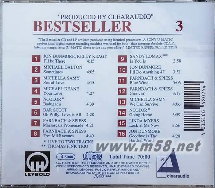 BESTSELLER 3 大針版 干凈的聲音(m58.net) Clearaudio是德國一家音響設(shè)備小廠,產(chǎn)品售價昂貴,但做工精細品質(zhì)優(yōu)良。 許多Hi-End設(shè)備生產(chǎn)廠家對音響錄音都有與眾不同的獨特理念,造成他們常有“跨界”兼營唱片錄音的舉措,Clearaudio就是其中之一。他們從1991年涉足錄音領(lǐng)域,不僅自己錄音,也委托別的發(fā)燒唱片公司代為制作唱片。 這張俗稱《大砧版3》的示范碟就是和捷克的發(fā)燒唱片廠OPUS合作錄制的,是一張爵士、人聲試音發(fā)燒碟。