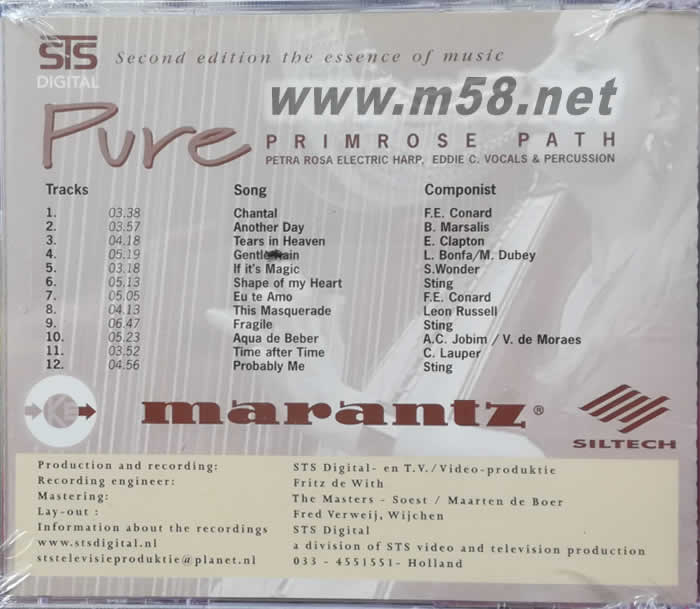 PRIMROSE PATH 純凈人聲PURE THE ESSENCE OF MUSIC 純真(m58.net) 這隊來自風車國荷蘭的Pure一男一女二人組合,成員分別為電子豎 琴演奏家Petra Rosa和黑人敲擊樂手Eddie C.,這兩位天才橫溢,縱 橫多個不同派別音樂的資深玩家,在歐洲多個國家早已紅透半邊天, 今趟非常難得地走在一起,以清新感性 unplugged 手法重新翻唱十二 首經典流行曲作品如 Eric Clapton"Tears ln Heaven"、Stevie Wonder"If lt's Magic"、Sting "Shape Of My Heart"及Cindy LaUper"Time After Time" 等等。有關製作環節,本碟所有歌曲均在荷蘭一所名為STS Studio 灌錄,由Maxanter負責出品及發行,或許大家對於這家唱片公司認 識不多,但他們所用的錄音器材卻是不折不扣的發燒級品種,擄唱片小冊子內所指,由拾音器開始以至A/D轉換器、鑑聽系統跟全套 線材,皆為發燒友熟悉的Weiss、Siltech、Marantz及WBT等,可謂 名牌盡出,必然是信心保証。 歌曲方面,[Primrose Path]內全數作品皆由聲線低沉且略帶沙啞Eddie C.主打,加上Petra節奏優雅的豎琴伴奏,初次聆聽時感覺較為另 類,皆因Eddie的唱腔略帶美式騷靈音樂影子,但當聽了三幾首之 后便會適應,並且越聽越引人入勝,就以第八首"This Masquerade" 為例,Eddie的表達方式顯然沒有George Benson那樣肉緊造作,但 聽起來卻沒有丁點平板單調之嫌,歌詞內所散發的落幕失意氣息仍 能一一道破,有關錄音質素,聽畢全碟后發覺人聲跟樂器質感均非 常充實,細碎聲尾弱音亦夠齊全,定位更是Sharp到出奇,喜好另 類發燒軟件人仕懇請萬勿錯過!