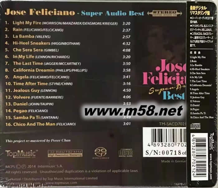 超級音樂與音響 Super Audio Best SACD(m58.net) 拉丁樂壇家喻戶曉的盲眼民謠吉他才子,二度榮獲葛萊美,精湛吉他與嘹亮歌聲魅力不可擋! ★ 專輯中結合熱情與浪漫,為名曲增添全新風貌! ★ Top Music發燒製作,優異音質重現歌手魅力! 荷西弗里西安諾是當今樂團最受推崇、最具代表性的拉丁吉他歌手之一。1945 年出生於波多黎各的他,因為先天性青光眼而失明。然而,喪失視力反而讓他更早開啟音樂天賦,幼年時期開始學習手風琴,九歲便開始在紐約波多黎各劇院演奏。十二歲時,他從爸爸手中獲得吉他,便能靠聆聽各類曲風自學彈奏,奠定了他獨特的演奏風格。 與巴布狄倫及瓊拜雅同時發跡的他,獲得 RCA 公司注意而成為旗下簽約藝人,並以拉丁風格重新詮釋門戶合唱團的〈Light My Fire〉在各國排行榜創下驚人佳績。1970 年,再度以《圣誕快樂》專輯創下銷售巔峰,同名單曲不但翻唱無數,更成為美國每年圣誕必播歌曲。本精選集收錄他當年的成名演奏以及翻唱歌曲,融合拉丁的熱情以及輕音樂的浪漫,展現出不拘一格的音樂才華,透過 Top Music 的母帶重製,音質發燒,更具魅力。