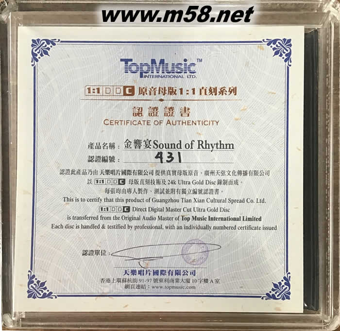 SOUND OF RHYTHM 金響宴 1:1母盤直刻碟(m58.net) 《響宴》(Sound Of Rhythm)專輯封面上印有“The Best Chinese Music For The World”,因此這張唱片是一盤純粹的什錦炒飯:郭文景創(chuàng)作的以中國(guó)打擊樂及人聲演繹的《無詞劇》;無伴奏童聲合唱《小白菜》;陜西民歌《三十里鋪》;云南少數(shù)民族意味的《彝舞曲》和《云之南》;樂器獨(dú)奏《高山流水》、《塞外情思》(中胡)。唱片中還有勃拉姆斯創(chuàng)作于1868年的《搖籃曲》和比利時(shí)作曲家拉奈創(chuàng)作的《回響》。 《Sound Of Rhythm》錄制用的是小型調(diào)音臺(tái),這使得噪聲降低,聲音更為逼真,而且它的母碟為美國(guó)Alloy Gold 制造,保證了聲音質(zhì)量,這張唱片堪稱經(jīng)典。