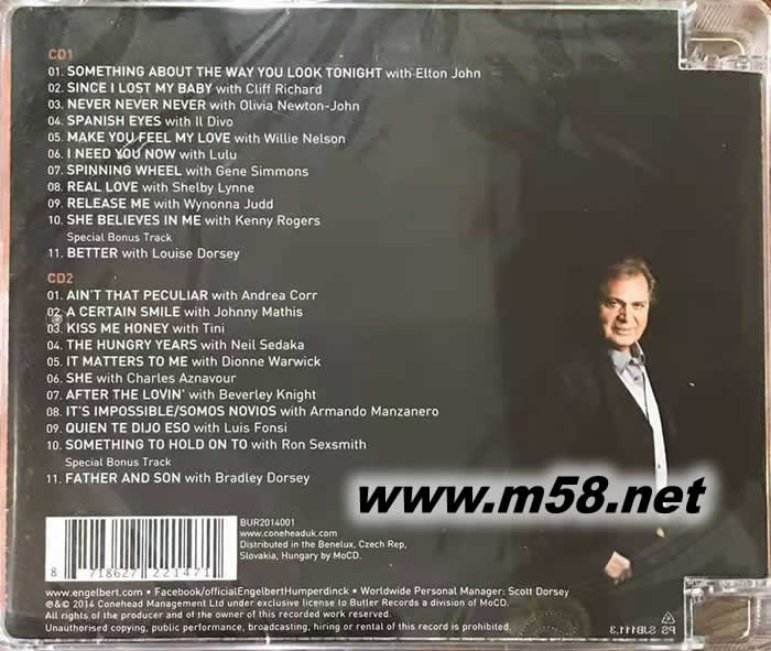 1. Something About The Way You Look Tonight (With Elton John) 2. Since I Lost My Baby (With Cliff Richard) 3. Never Never Never (With Olivia Newton-John) 4. Spanish Eyes (With Il Divo) 5. Make You Feel My Love (With Willie Nelson) 6. I Need You Now (With Lulu) 7. Spinning Wheel (With Gene Simmons) 8. Real Love (With Shelby Lynne) 9. Release Me (With Wynonna Judd) 10. She Believes In Me (With Kenny Rogers) 11. Better (With Louise Dorsey) Bonustrack CD 2